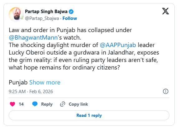 “మరోసారి పంజాబ్లో లా అండ్ ఆర్డర్ పూర్తిగా విఫలమైంది. జలంధర్ మోడల్ టౌన్లో గురుద్వారా బయట ఆప్ నేత లక్కీ ఒబెరాయ్ను కాల్చి చంపారు. ఆప్ పంజాబ్కు పాపంగా మారింది,” అని వ్యాఖ్యానించారు.